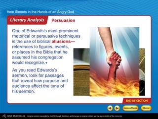 Allusion gets emotional reactions. Out of his 1200 sermon the most famous one is Sinners in the Hands of an Angry God which help trigger the Great Awaking from 1737-1750. Edwards warns his audience of the ever-present possibility that they will of sin and be sentenced to damnation.